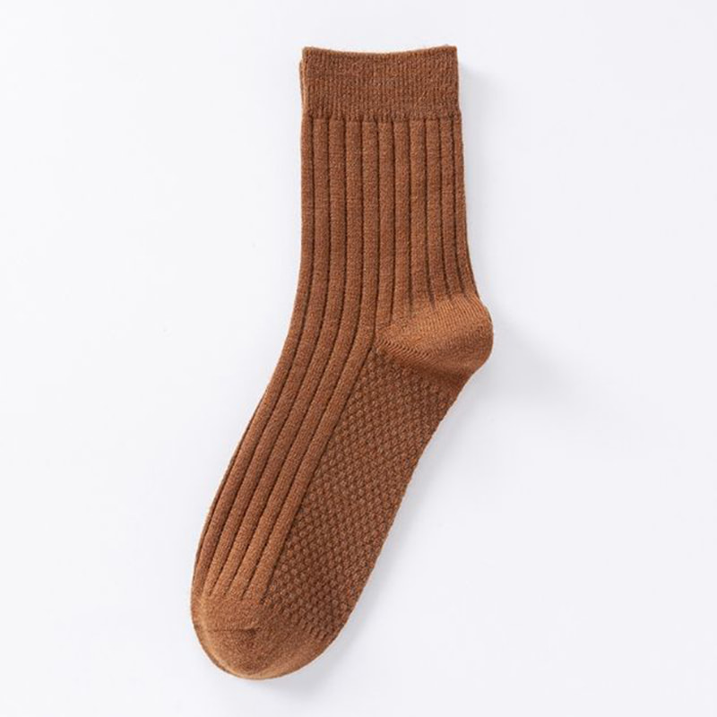 A gyapjú egy természetes és környezetbarát állati fehérje rost, finom és puha, szigetelő hatással. A gyapjúszál sima és bolyhos, és zokniba szőtt, meleg, szilárd, kényelmes és kopásálló. A gyapjúnak is jó nedvességi felszívódása és légzőképessége is van, ami hatékonyan felszívhatja a nedvességet és az izzadást a lábakból, szárazon tartva. Egyes termékek juhgyapot és poliészter kompozit rugalmas szálas anyagot használnak, kombinálva a gyapjú melegségét és a poliészter szál rugalmasságát, hogy javítsák a viselet kényelmét. A középső cső zokni hossza lefedheti a borjút, növelve a meleg tartományt és megakadályozva a hideg szél invázióját, különös tekintettel az őszi és téli szezonokban. A zokni száj és a test rugalmas kialakítása szabadon beállíthatja a szorítást, hogy alkalmazkodjon a különböző emberek lábformájához és a viselési igényekhez. Ez nem szorítja meg a bokát vagy meglazul, és a gyapjú lágysága miatt a zokni kényelmesen érzi magát, amikor a bőrrel érintkezik, irritáció nélkül. A gyapjú nedvességi felszívódása és izzadság-elrontó teljesítménye szárazon tarthatja a lábakat és csökkentheti a baktériumok növekedését. A lábszag megelőzése.